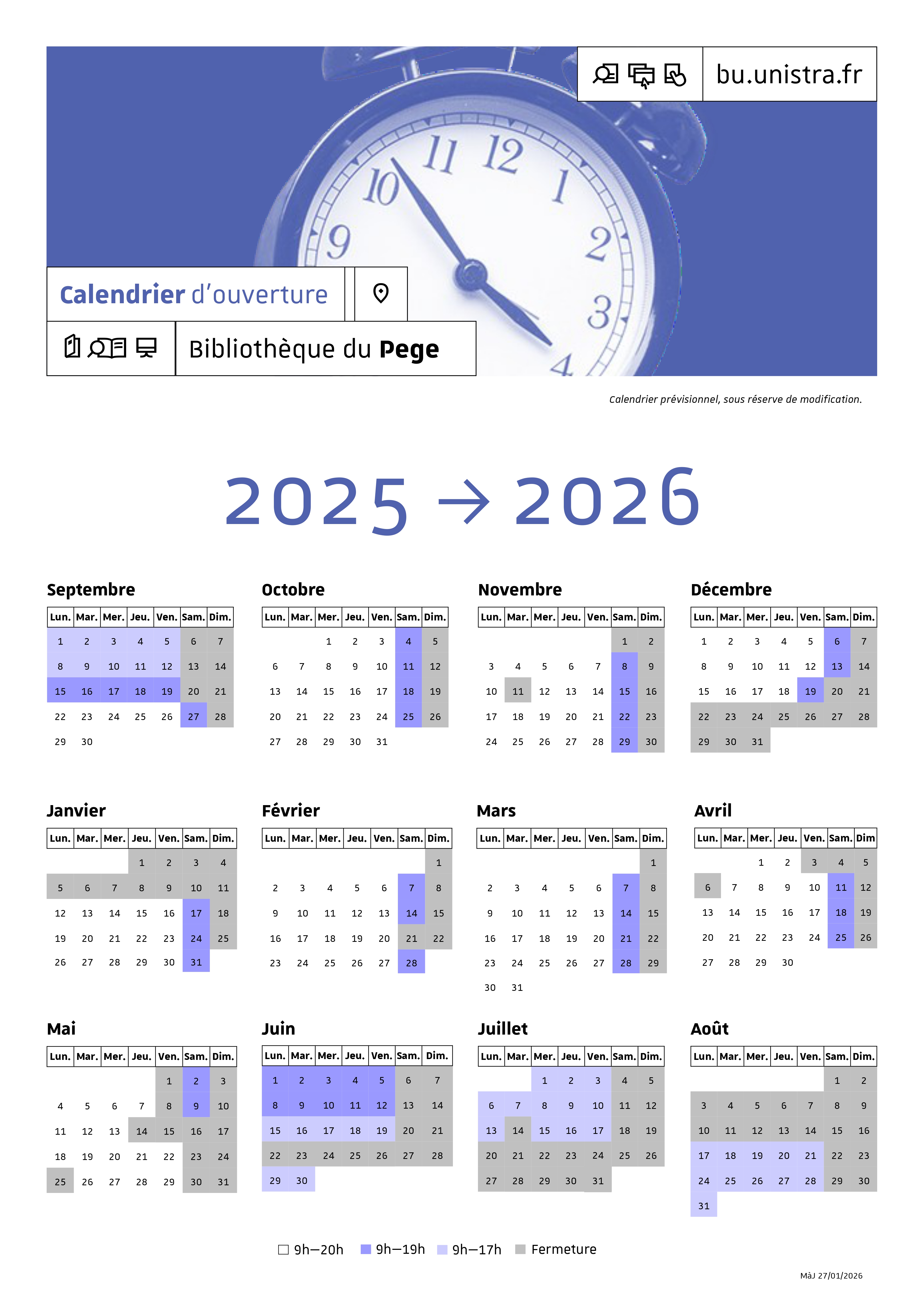 Accès totalAccès pour les personnes à mobilité réduite : entrée avenue de la Forêt Noire, ascenseur pour accéder à la bibliothèque. En salle : accès à des places prioritaires et à 2 tables réglables en hauteur. Référent handicap disponible sur place ou par mail bu-pege@unistra.fr