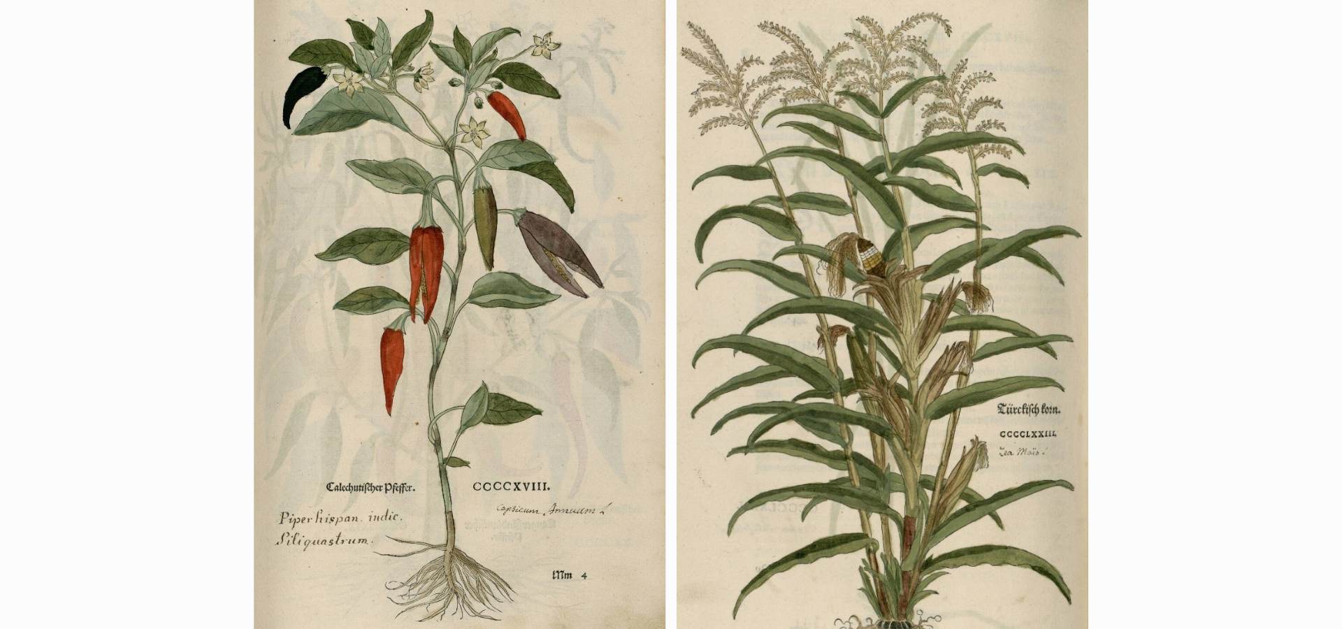 Illustrations de piments (Capsicum annuum, planche 418) et de maïs (Zea mays, planche 473).