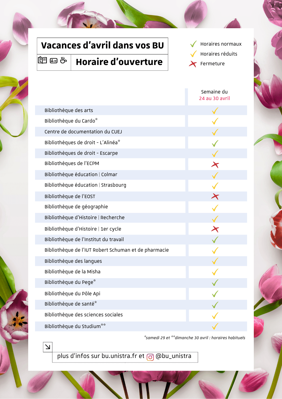 Ouvertures et horaires des BU pendant les vacances de printemps