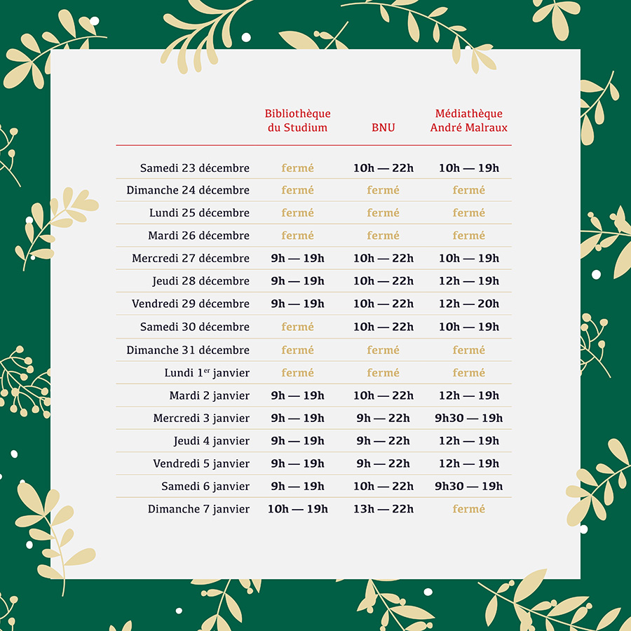 La bibliothèque du Studium, la Bibliothèque nationale et universitaire (BNU) ainsi que la médiathèque André Malraux vous accueillent pendant les vacances de fin d'année !